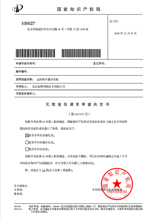 2025年12月01日,国家知识产权发出第610172号无效决定,宣告北京速帮网络技术有限公司拥有的名称为“电梯智能群控系统及分配方法 ”的专利权全部无效。