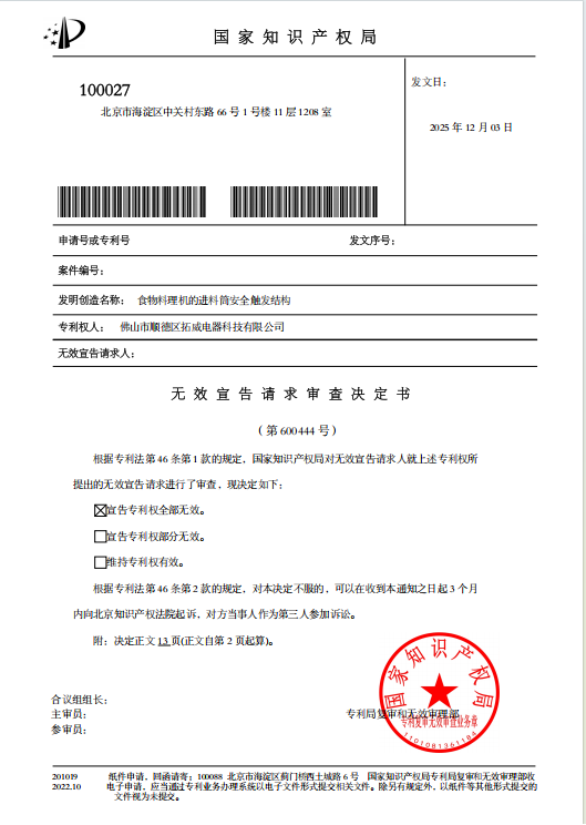 2025年12月03日,国家知识产权发出第600444号无效决定,宣告佛山市顺德区拓威电器科技有限公司拥有的名称为“食物料理机的进料筒安全触发结构”的专利权全部无效。